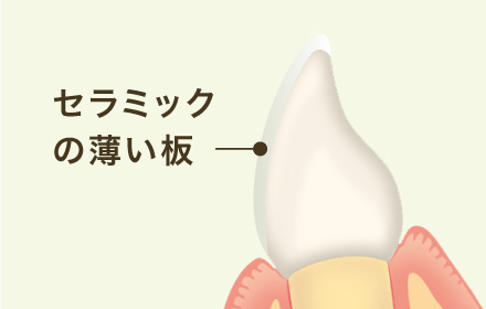 歯の表面を軽く削り、厚さ 0.1〜1.0 mm程の薄いセラミック片を特殊な接着剤で貼り付けて歯を白く見せることができます。ホワイトニングでは落とせない強い変色や神経を取って変色した歯も白くきれいにすることができます。また、歯の隙間を埋めることで歯並びを整えることもできます。